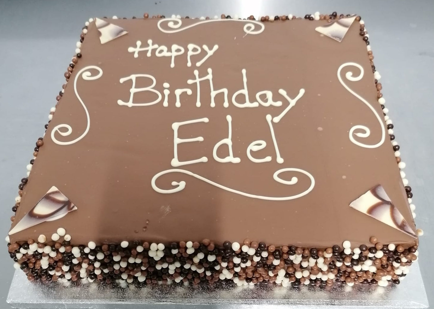 Finished with smooth chocolate with a white piped personalised message.